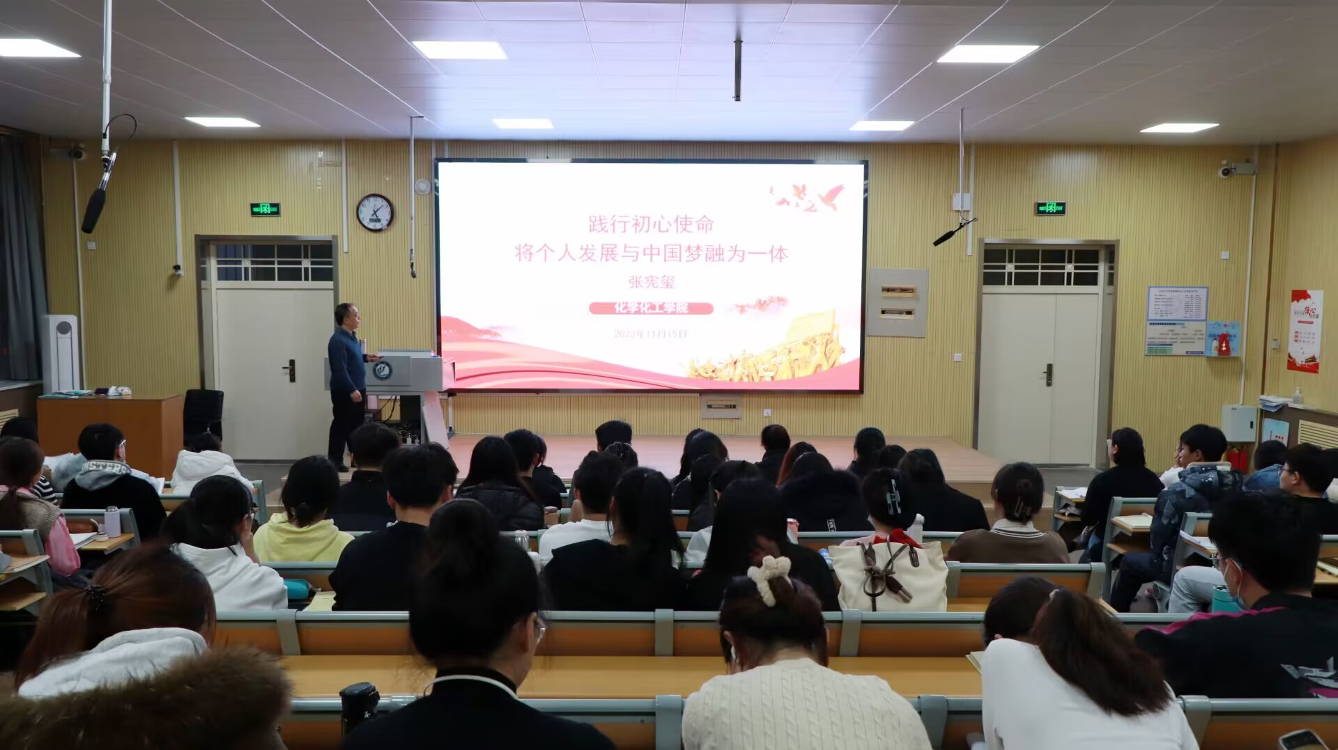 张宪玺以“践行初心使命,将个人发展与中国梦融为一体”为题,围绕形式与挑战、指导思想、发展目标、系列工程以及总结与展望五个方面展开讲解,深度剖析了当代大学生面临的机遇与挑战及新时代赋予的使命任务。张宪玺以新时代科教兴国战略为切入点,指出要建设“宜居宜业”型学院,打造“学习型、专业型、研究型、创新型、专家型”的教师队伍,切实做好青年项目和学术论文工作,引导同学们创新发展,加强现代化高素质人才培养,通过“升级换代”、“以赛代练”、“分类培养”工程,培养会学习、能实践、会创新、敢创业的一流拔尖学生。他强调,作为入党积极分子要勇于砥砺奋斗,坚定理想信念,脚踏实地担起党和人民赋予的时代重任。