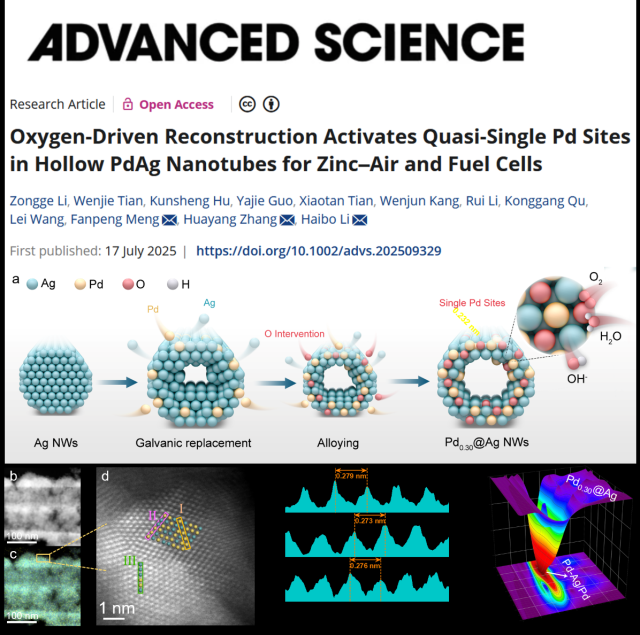 近日,英国365上市公司李海波团队揭示了界面氧原子能够改善临近Pd原子的局部电荷密度和能带结构,可以高效驱动电催化氧还原反应,相关研究以《氧元素激活空心PdAg纳米管中的钯原子位点应用于锌空气电池和燃料电池》(Oxygen-Driven Reconstruction Activates Quasi-Single Pd Sites in Hollow PdAg Nanotubes for Zinc-Air and Fuel Cells)为题发表在国际顶尖学术期刊《尖端科学》(Advanced Science)(中科院1区,IF = 14.1)。该期刊是跨学科的高影响力期刊,专注于材料科学、化学、生物科学和工程领域的创新研究。