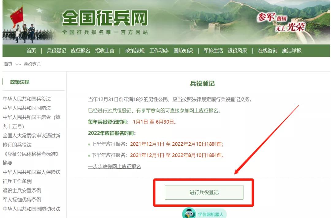 在这个页面中,会告知报名时间以及参军政策说明,建议大家认真阅读后,点击“进行兵役登记”,迈出你军旅生涯的第一步哦!