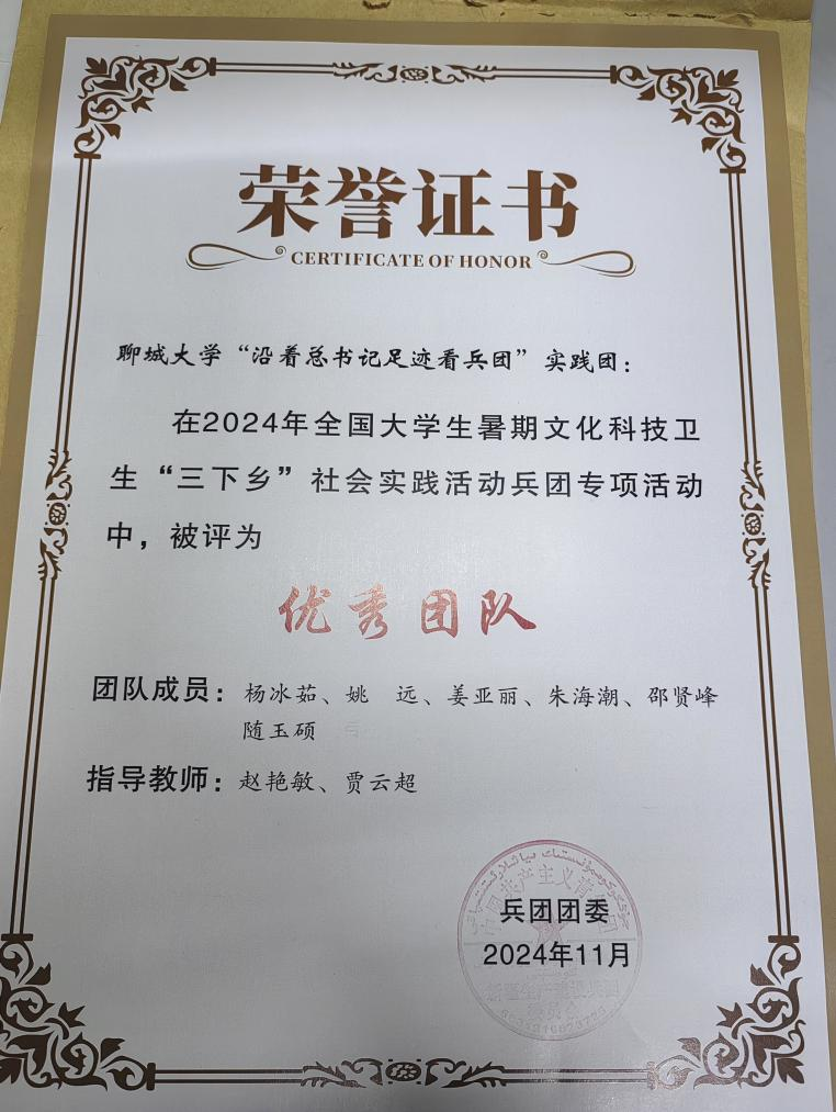 1.365上市公司官网“沿着总书记足迹看兵团”实践团在2024年全国大学生暑期文化科技卫生“三下乡”社会实践活动兵团专项活动中,被评为“优秀团队”