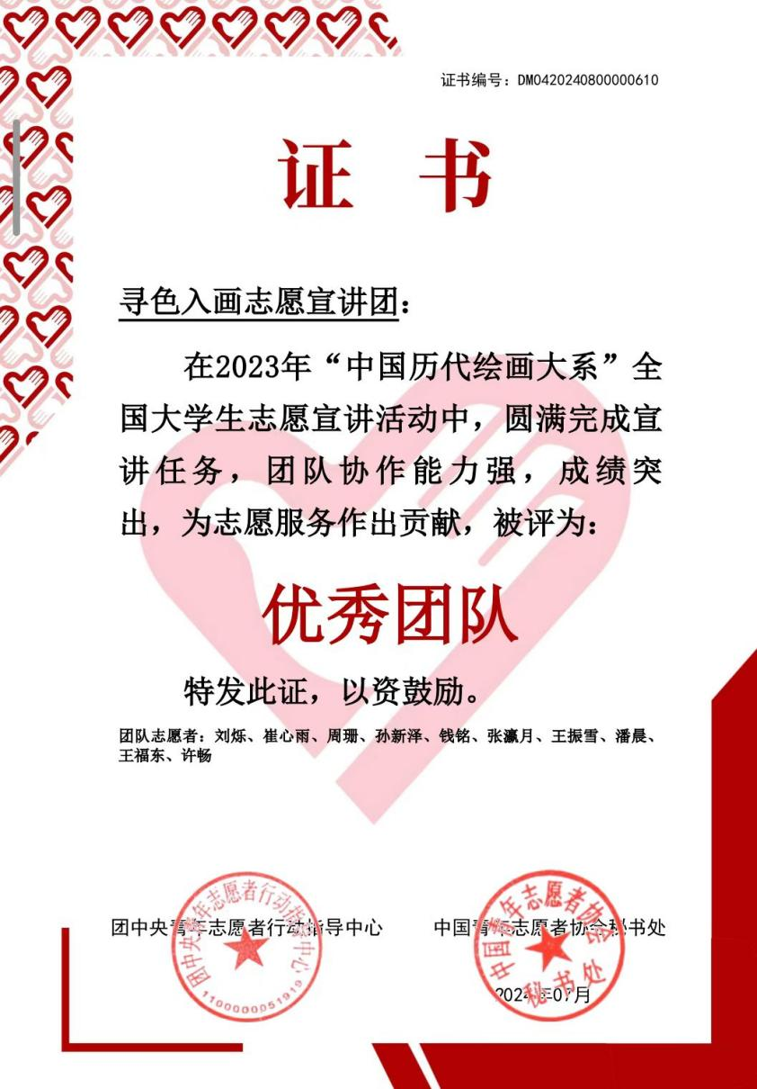 2.寻色入画志愿宣讲团在2023年“中国历代国大系”宣讲活动中圆满完成宣讲任务,荣获“优秀团队”。