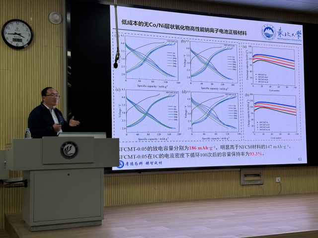 伊教授首先介绍了他们课题组的研究工作,“锂离子电池正极材料”、“锂离子电池钛酸盐负极材料”、“超级电容器材料”“水系锌离子电池”等,引起了参会师生的极大兴趣。在“碳中和”“碳达峰”的政策目标指引下,在锂离子资源有限的背景下,为推进先进储能技术规模化应用,伊教授课题组从钠离子电池开始研究,取得了丰硕的学术成果。在会上,伊教授为大家展示了“O3相铁锰铜基层状正极材料”、“P2相铁锰铜镍基层状正极材料”、“低成本的无Co/Ni层状氧化物高性能钠离子电池正极材料”等其课题组的一系列科研成果,为大家展现了一次丰富的学术报告。报告深入浅出、图文并茂、精彩纷呈,拓宽了参会师生的学术视野,引起了师生们的阵阵掌声。